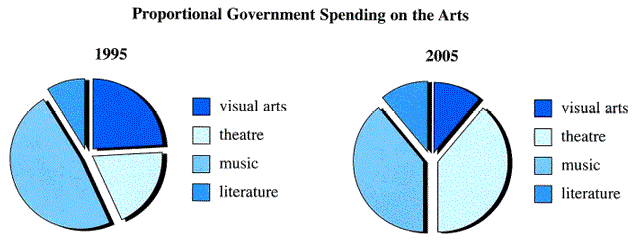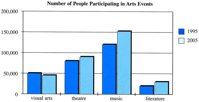 The charts below show one government's spending on culture and education in 1995 and 2005 and the number of people participating in Arts events in the same years.