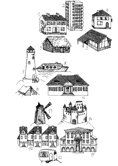 bungalow - block of flats - caravan - castle - cottage - detached house - houseboat - lighthouse - mansion - palace - semi-detached house - tent - terraced house - windmill - |